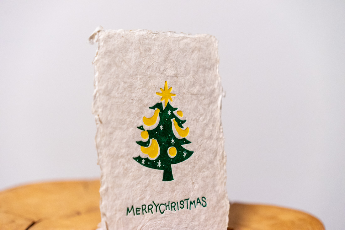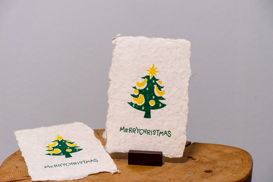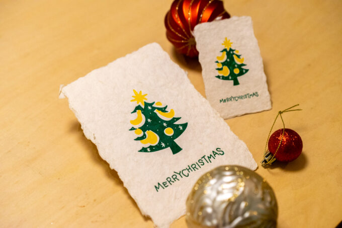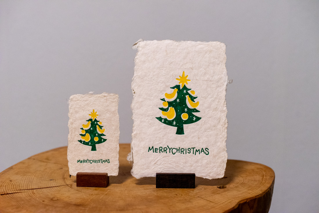フィリピンで手作りしたバナナペーパー「バナナフル」に、活版印刷による2色刷りを施しました。