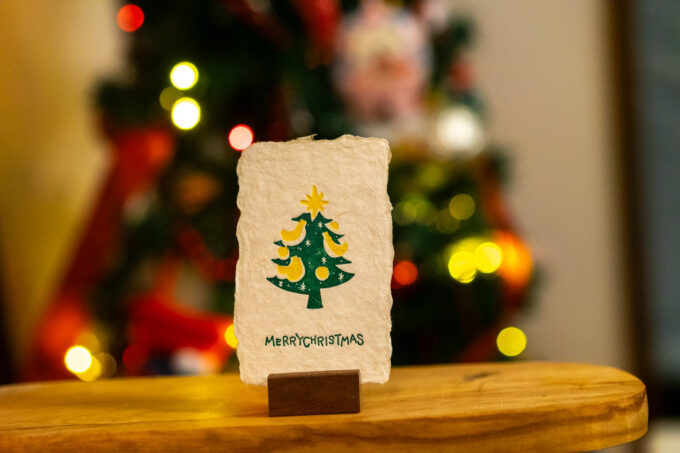 フィリピンで手作りしたバナナペーパー「バナナフル」に、活版印刷による2色刷りを施しました。